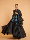 Black chanderi short anarkali with gradient blue threadwork booties, umbrella skirt and dupatta to match