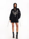 Black fleece oversized hoodie dress with embroidered necklace, zipper and crystal rope detail.