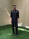 BLACK LINEN PATHANI KURTA WITH CROCHET AND CRYSTAL ROPE DETAILING.