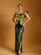 Teal-yellow brocade quilted structural corset.