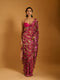 Skin net saree with fuchsia sequin cheetah motif embroidery.Paired with fuchsia brocade and silk corset