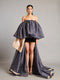 Black microfiber mini dress with charcoal organza & gold textured lamé bauble insets & trail