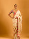 Cream chanderi saree with fuchsia-orange crystallized booties & chevron border.Paired with multicolor paneled brocade blouse