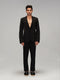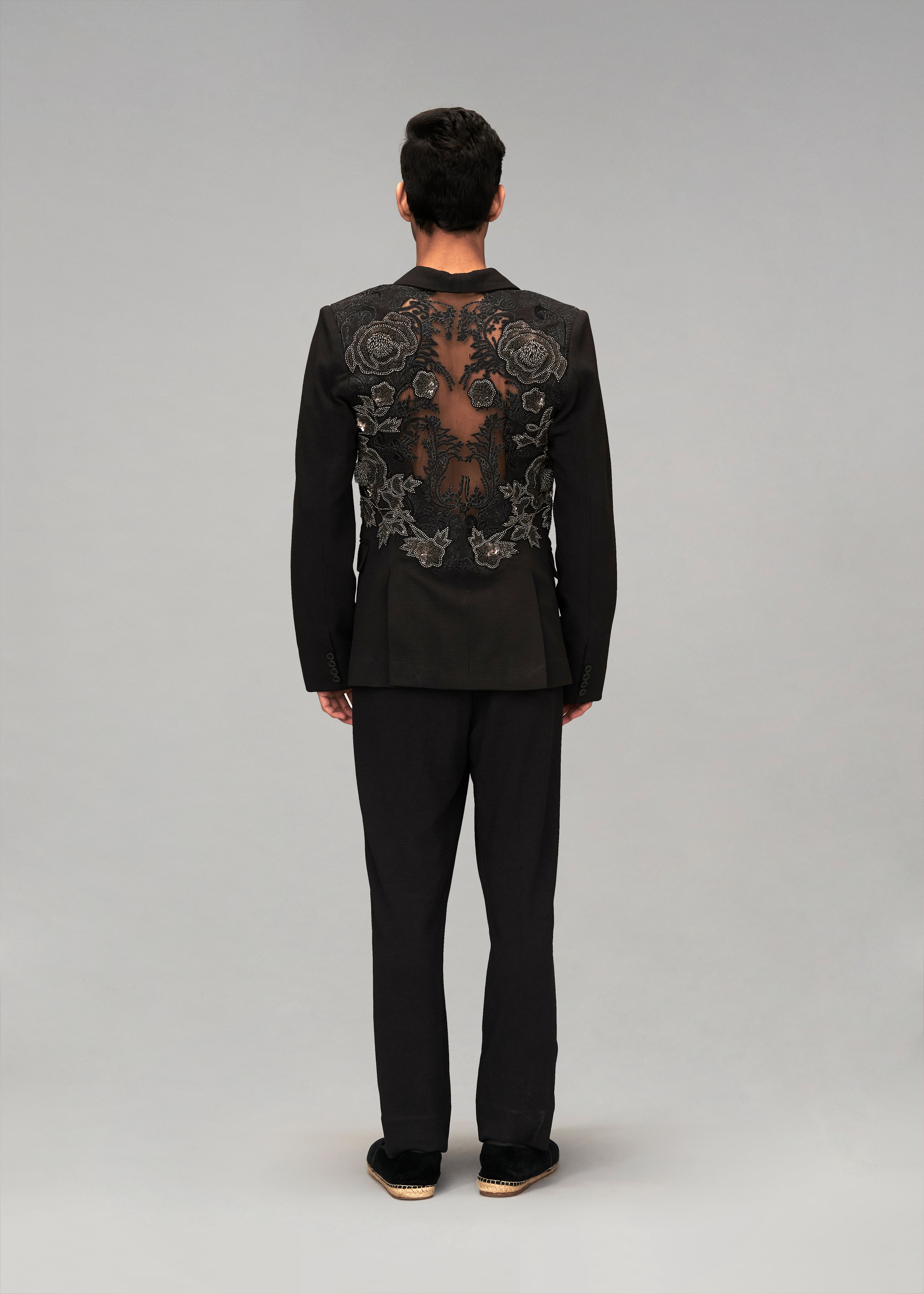 Black double knit suit with sheer window, lace work & 3D floral embroidery