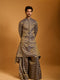 Charcoal chevron organza quilted zipper bandi with matching draped kurta and hakama pants.
