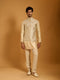 Dull gold chanderi paneled zipper bandi with threadwork & crystal embroidery paired with chanderi jacquard kurta Pants included.