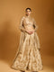 Beige taffeta lehenga with gold applique Paired with gold strip work zipper blouse and dupatta to match.