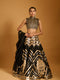 Black raw silk lehenga with gold-gunmetal chevron strip work & idol face motif applique Paired with intreciatto blouse and organza dupatta.