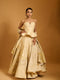 Cream taffeta lehenga with gold applique Paired with cream quilted peplum corset & dupatta to match.
