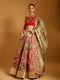 Multicolor paneled brocade lehenga with red strip work sheer blouse & brocade strip work border tissue dupatta to match.