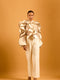 Ivory silk organza shirt with metallic pleated ruffle detail.